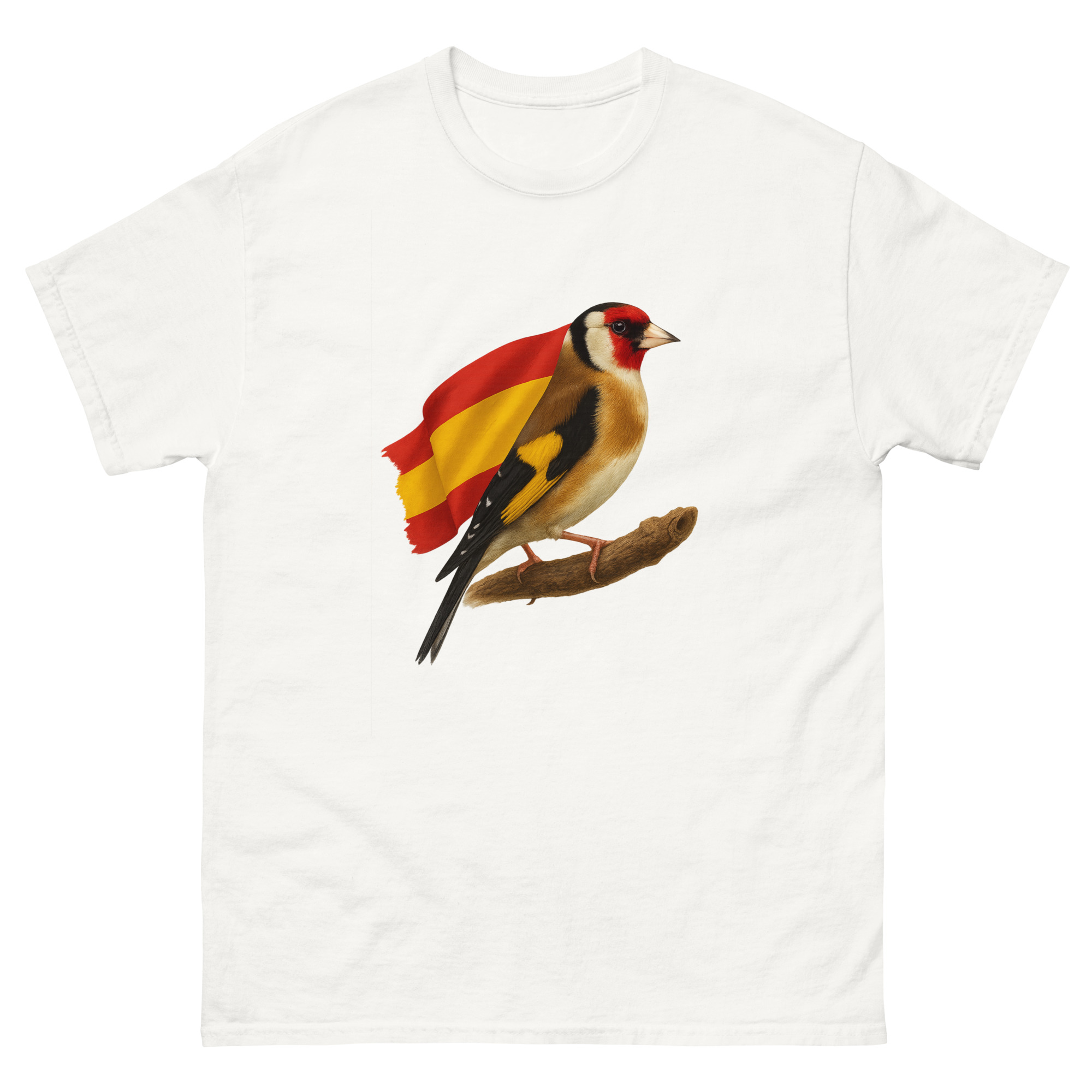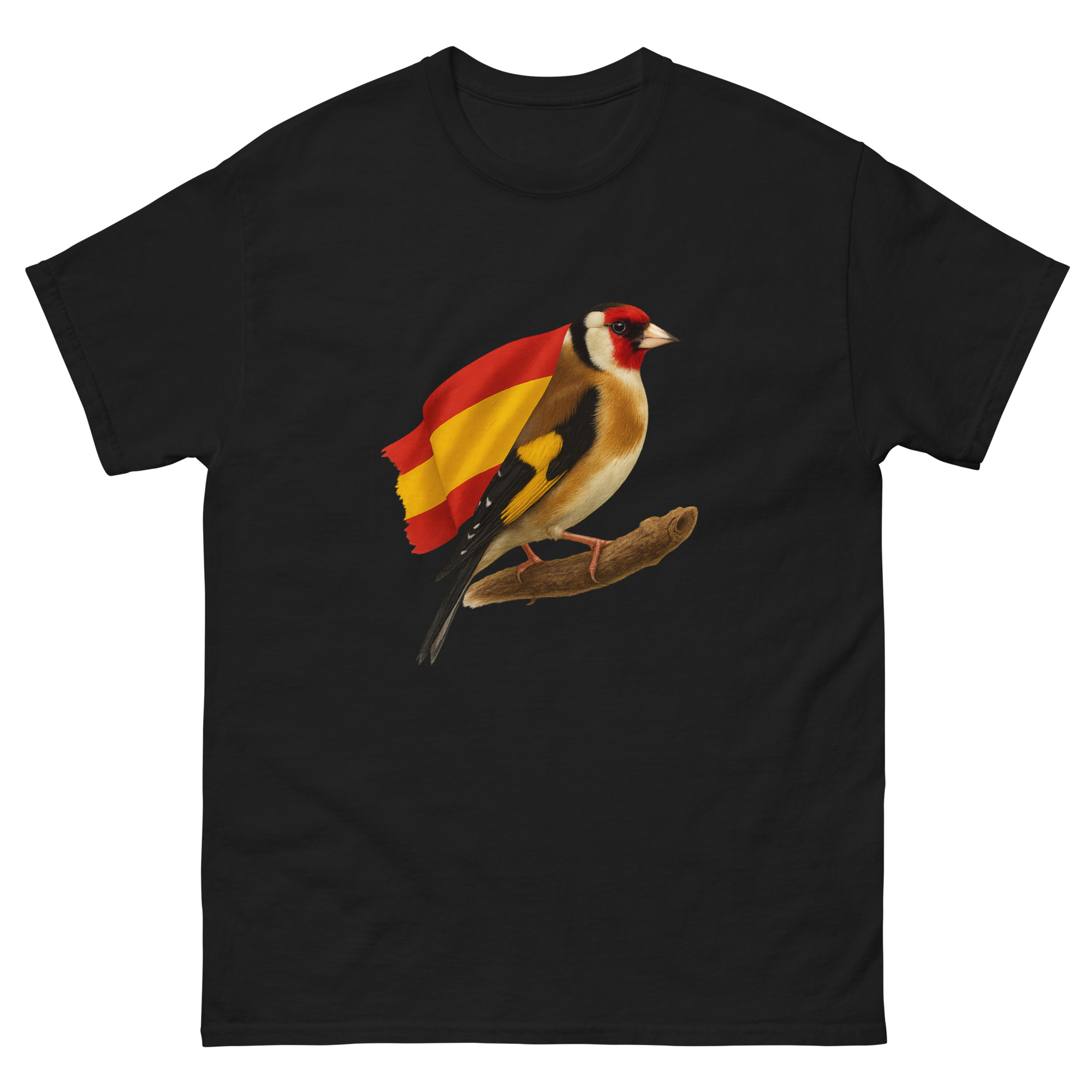 Este diseño representa a un jilguero con todo su detalle y color natural, acompañado por la bandera de España ondeando en movimiento a su espalda. Una imagen pensada para quienes sienten orgullo de su país y de su afición, para los que entienden que llevar un jilguero es una forma de expresar quién eres y a qué perteneces.