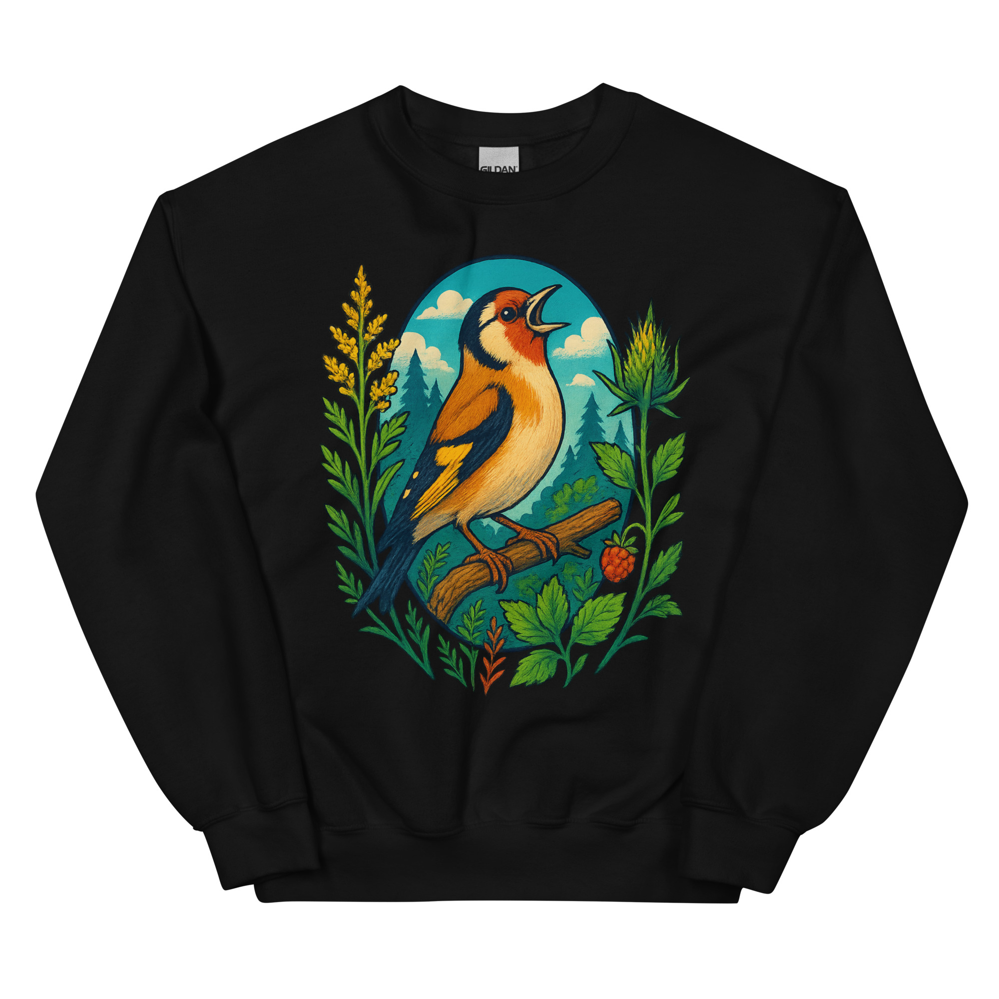Sudadera premium con un estampado exclusivo del jilguero cantando, representado con gran detalle y colores definidos. El diseño destaca la postura clásica del jilguero cuando emite su canto, rasgo por el que esta ave es tan apreciada por aficionados y entusiastas: su belleza, su expresión y la fuerza de su canto.
