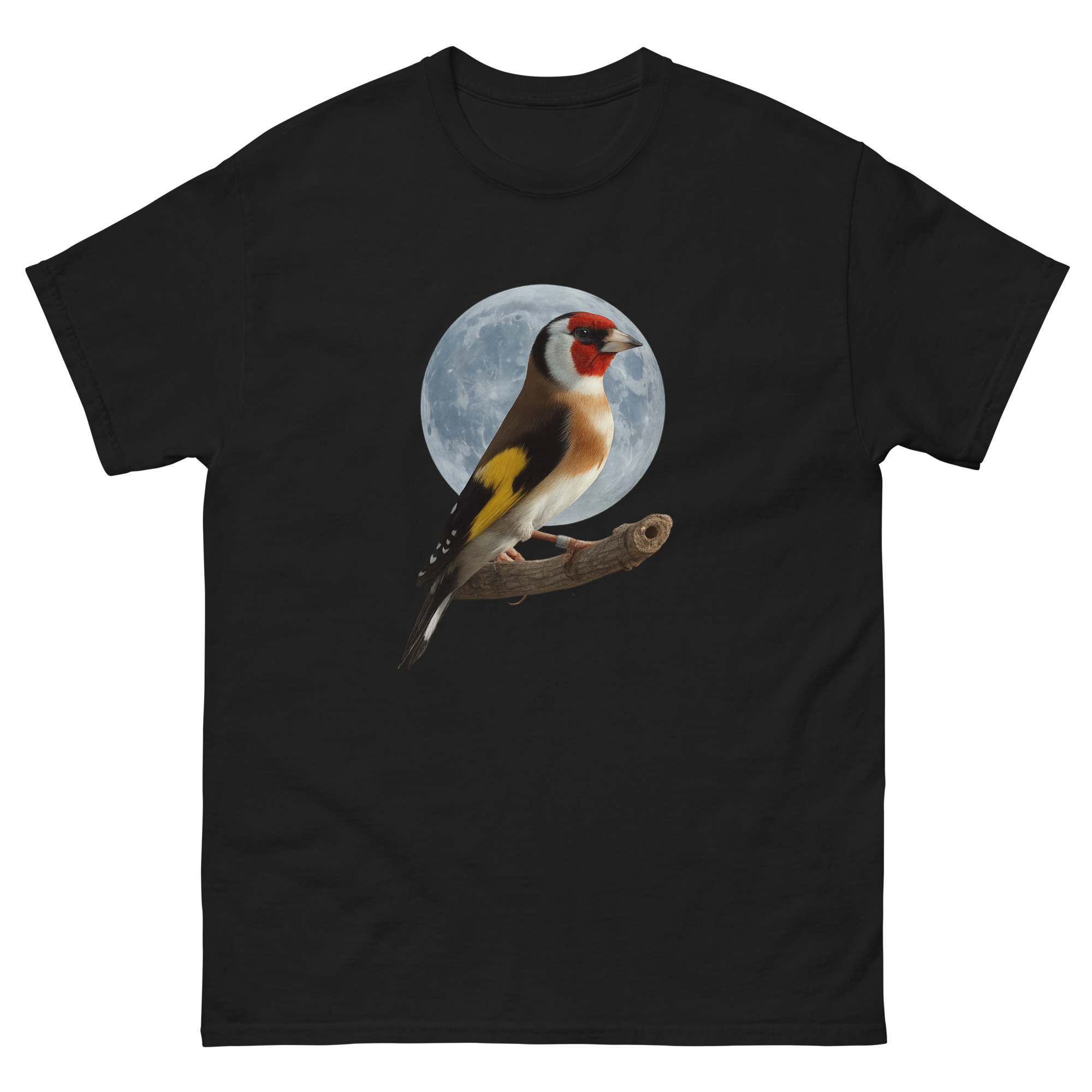Este diseño presenta un jilguero en una postura serena y elegante, con la luna llena a su espalda, creando una atmósfera tranquila y relajada que realza la belleza natural del ave y sus colores.